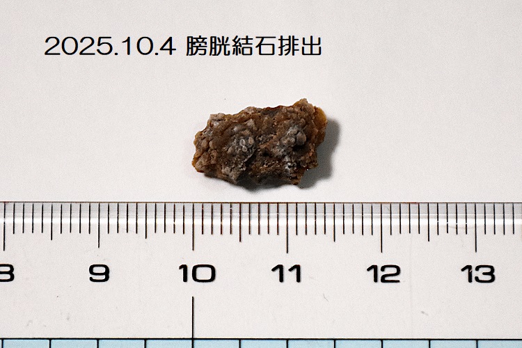 2025年10月 4日 泌尿器科で痛み止めと紹介状を出して頂き、月曜日には国立病院を受診する段取りをしていたら、石は自力で出てきた。長径15mm。