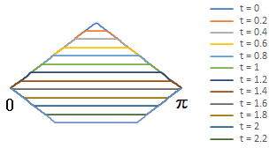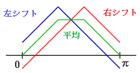 となり、時刻 $t$ での波形は、初期の三角形の波形を左右に $ct$ だけシフトした波形の平均で台形になります。