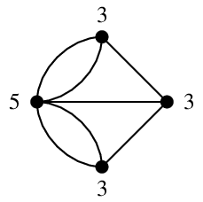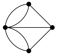 橋渡りのグラフでは4つの頂点の次数が 5, 3, 3, 3 ですので一筆書きができないことがわかります。