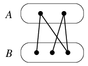 頂点集合 $V$ が交わりの無い2つの部分集合 $A$, $B$ に分かれ ( $V=A \cup B$,   $A \cap B = \emptyset$ )、 $A$ に属する頂点と $B$ に属する頂点の間にしか辺が無いグラフを二部グラフと呼びます。