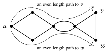 (2) $\Rightarrow$ (1)  $G=(V,E)$ の各連結成分が二部グラフであれば $G$ 全体も二部グラフになるので、 以下、$G$ が連結であると仮定して証明します。頂点 $u \in V$ をひとつ固定し、
