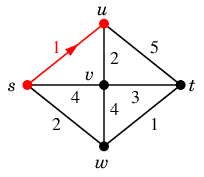 出発点 $s$ から直接見えるのは $u$, $v$, $w$ で、 このうち一番近い $u$ へ進みます。