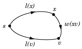 • $\ell(x)+w(xv)$ $=$ (確定している最短の $s$-$x$ 道 $+$ 辺 $xv$) の距離