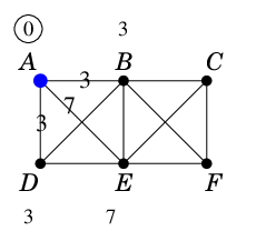 $A$ の隣接点 $B$, $D$, $E$ の仮ラベルを、$A$ からの距離 3, 3, 7 に更新します。