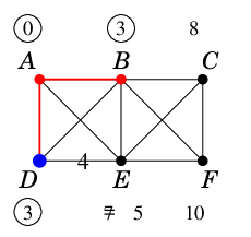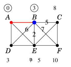 仮ラベル 3 の頂点 $B$, $D$ は親が同じ $A$ ですから、アルファベット順で若い方の $\ell(B)$ を永久ラベルに昇格させます。