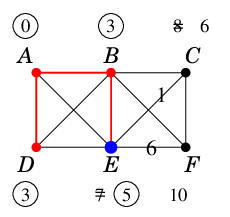 $B$ の未昇格な隣接点の仮ラベルを 5°に従って更新します。 特に $E$ は $B$ を経由したルートの方が短いので仮ラベルが 7 から 5 に減ります。
