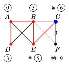 $C$ は $E$ を経由したルートの方が短いので仮ラベルが 8 から 6 に減ります。