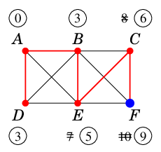 目的地のラベル $\ell(F)$ が永久ラベルに昇格して終了します。 最短路は $A$ $\rightarrow$ $B$ $\rightarrow$ $E$ $\rightarrow$ $C$ $\rightarrow$ $F$ となりました。