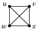 今日のテーマは「グラフの平面性」です。 グラフはいつも平面の上に描いているのに「何を今さら」と思うかもしれませんが、 例えば図の $K_4$ では $ux$ と $vw$ は本当は交点を持っていないのに、 初学者はそこに交点があるように誤解してしまいます。