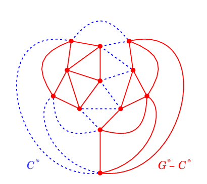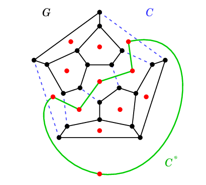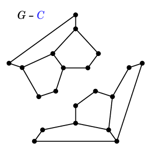 (2) の $\Rightarrow$ )  $C$ が閉路ならば、 $C$ は $G$ の面たちを2つの連結なグループに分けます。 すなわち $C$ は $G\as$ を2つの連結成分 $G\as_1$, $G\as_2$ に分けます。