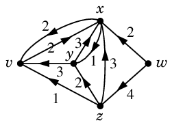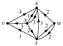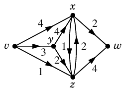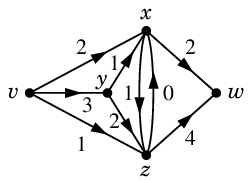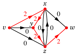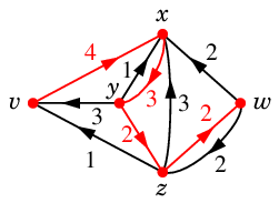 Rem.13 弧の容量が全て整数値の場合(実用ではたいていそうです)、 Alg.12 のループ回数は多くとも容量の最大値以下ですから、 $P$ をみつけるのに幅優先探索を使えばこのアルゴリズムは高速に実行できます。