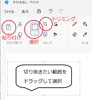 トリミング(切り抜き): 選択ボタンを押してから切り抜き範囲をドラッグして → トリミングボタン
