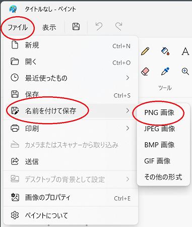 保存: ファイル → 名前をつけて保存 → 好きな形式(例えば png)を選んで保存