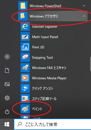 スタートボタン → Windowsアクセサリ → ペイント ( Win10 )