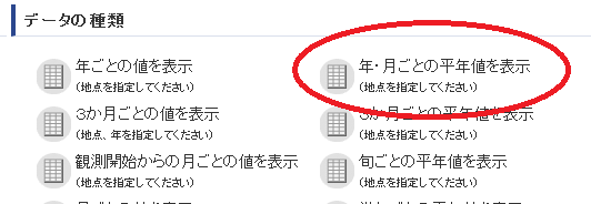 - 右の方の「年・月ごとの平年値を表示」をクリック。