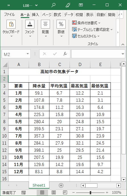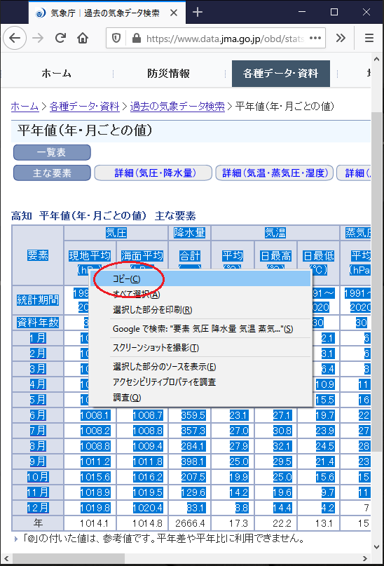 - 「要素」と書いてある行から12月の行の気温までをドラッグして → コピー ( [Ctrl] + C )
