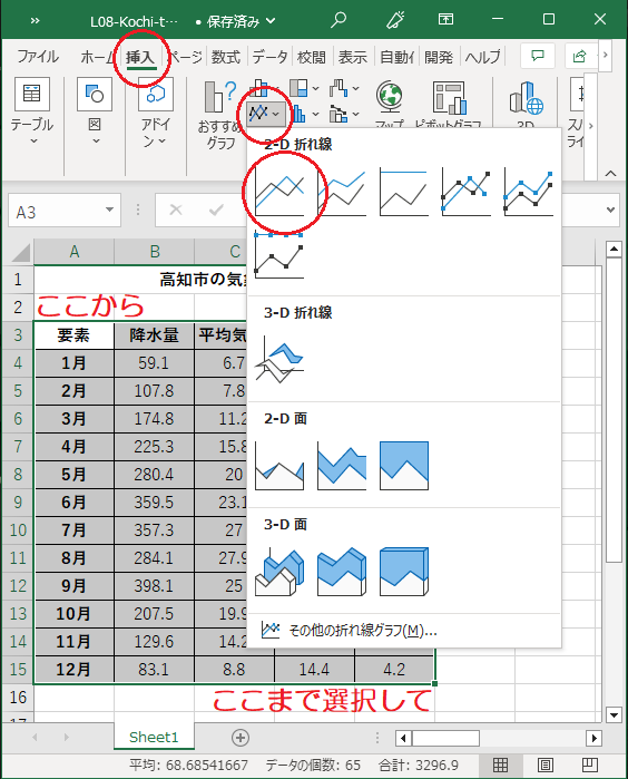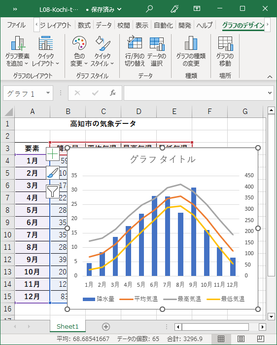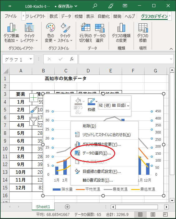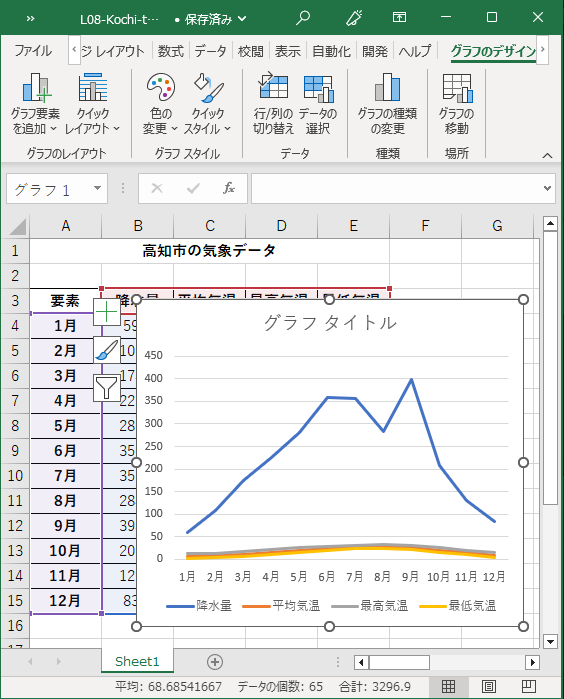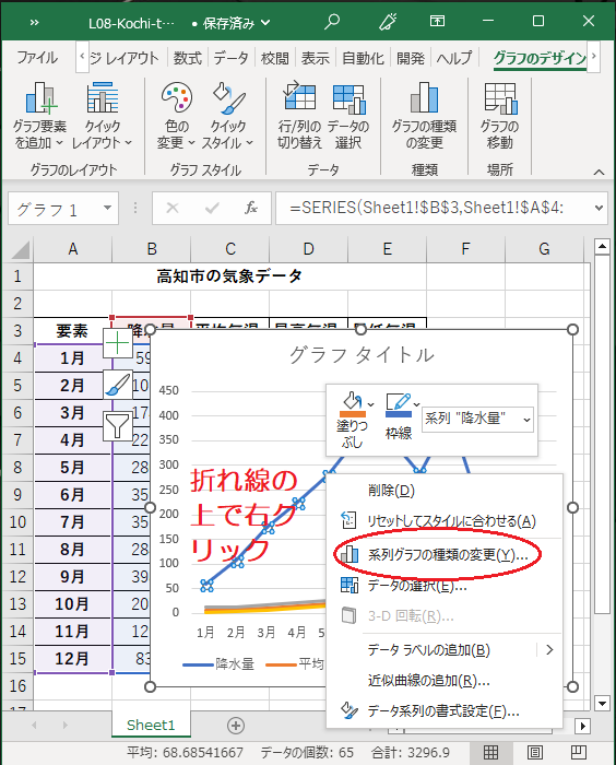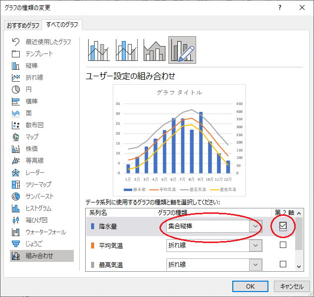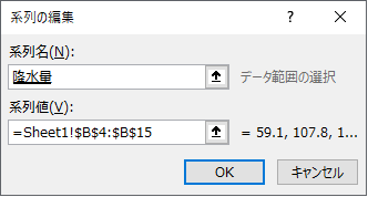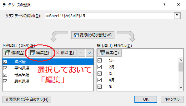 - 系列名が、降水量・平均気温・最高気温・最低気温になっていない人は系列名の変更をします。