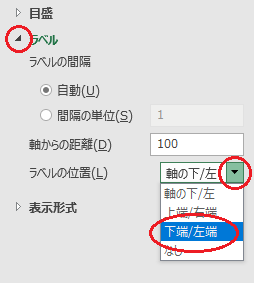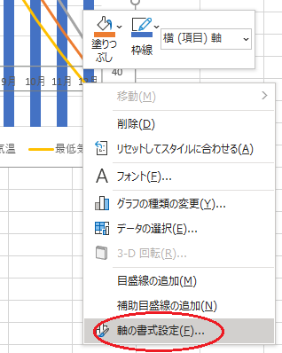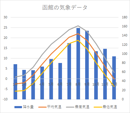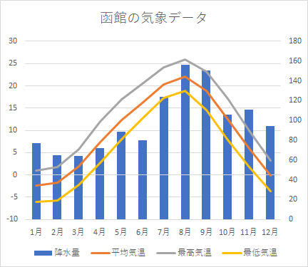 例えば函館は気温が低いので、上述の手順では横軸ラベル ( 月 ) とグラフがかぶってしまいます: